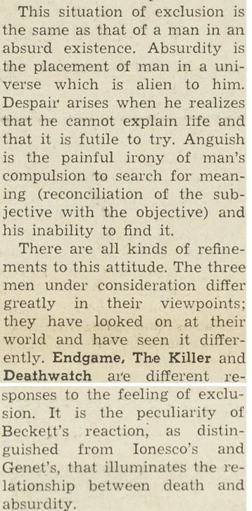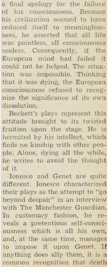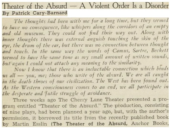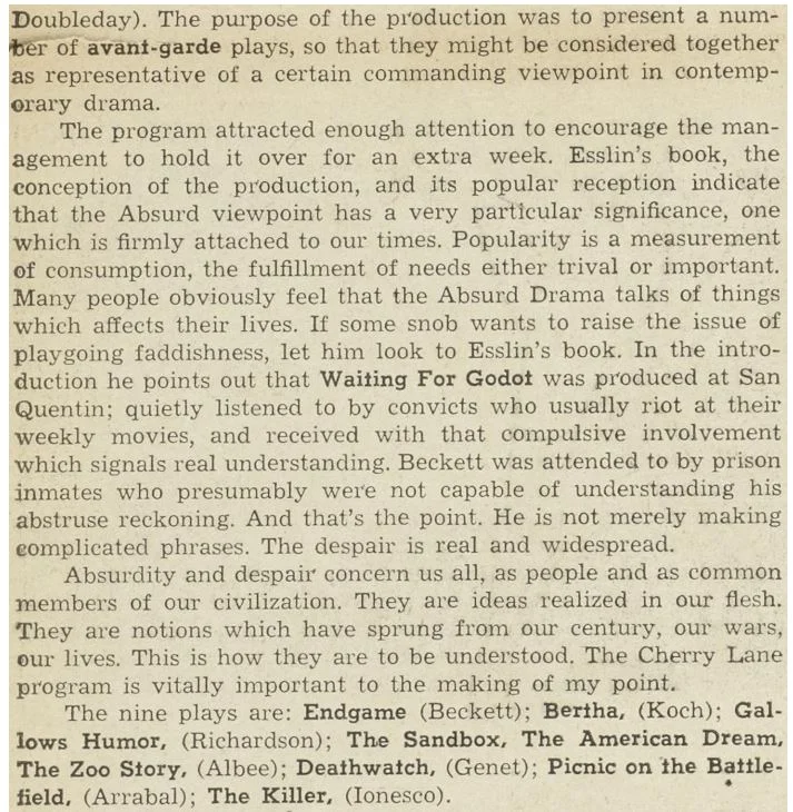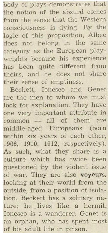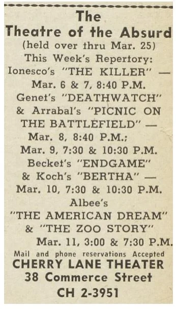 by Samuel Beckett, Kenneth Koch, Jack Richardson, Edward Albee, Jean Genet, Fernando Arrabal, and Eugene Ionesco