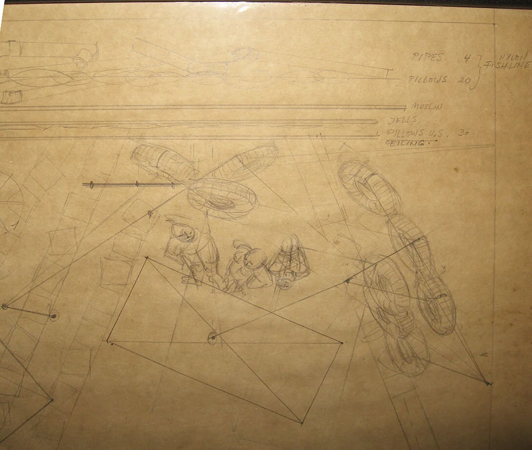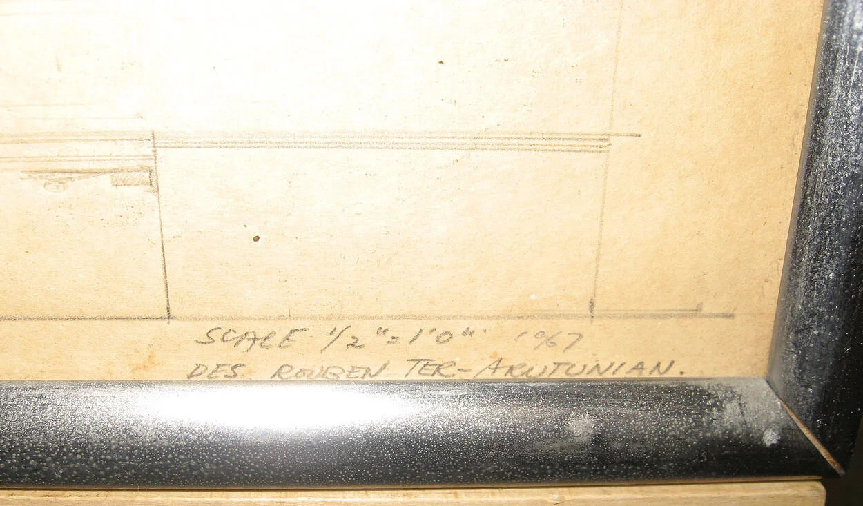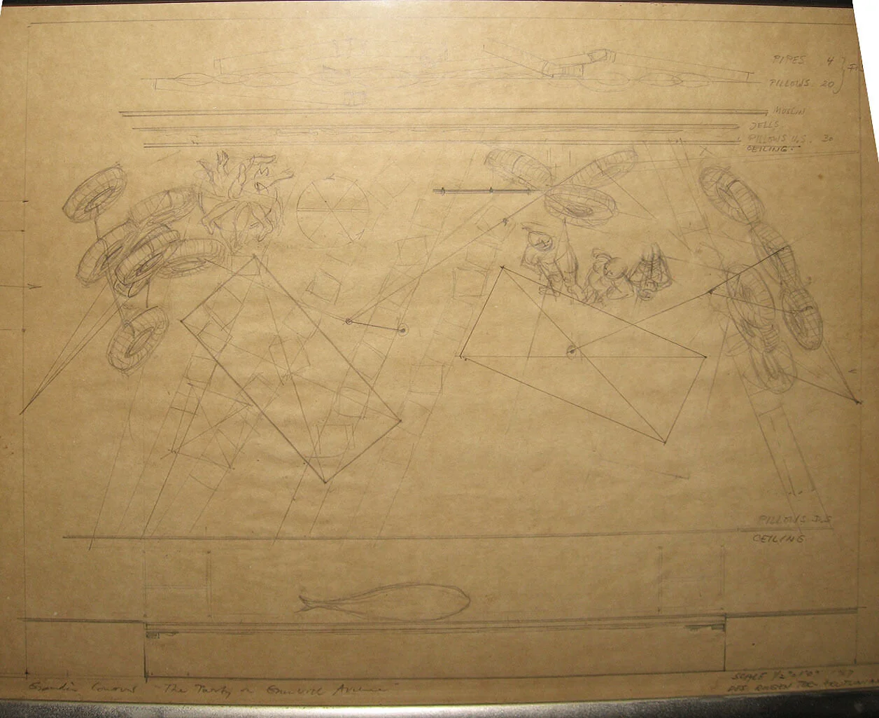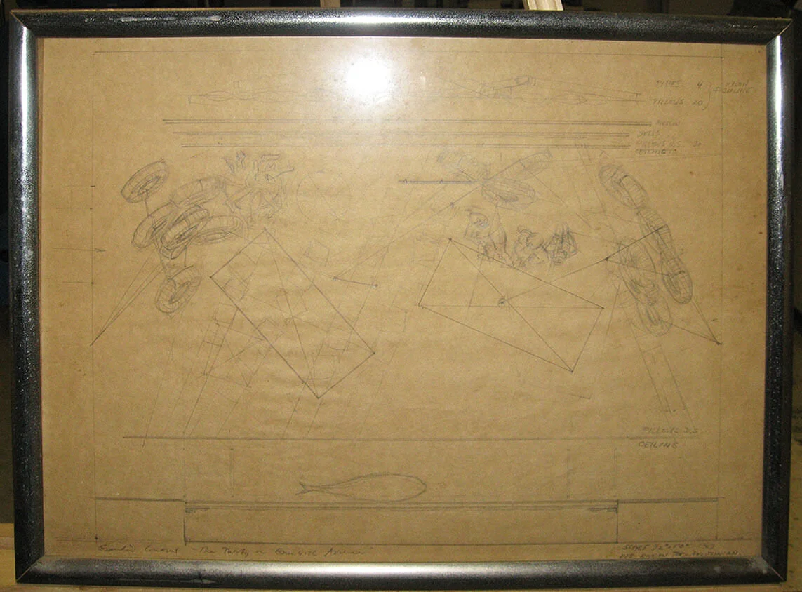 (photo of set design by designer Rouben Ter-Arutunian for the Broadway play The Party on Greenwich Avenue which appeared at the Cherry Lane Theater in 1967. Ter-Arutunian was born in Eastern Europe and studied in Berlin. He was a designer for the Dresden Opera and the Vienna State Opera before emigrating to the U.S. in 1951. In New York Ter-Arutunian became a prolific and influential designer for opera, ballet, and theater. He was the designer for the legendary Balanchine production of the New York City Ballet's Nutcracker, won a Tony award for Redhead in 1959, created numerous addtional designs for Balanchine, and designed for Martha Graham. More drawings are below.)