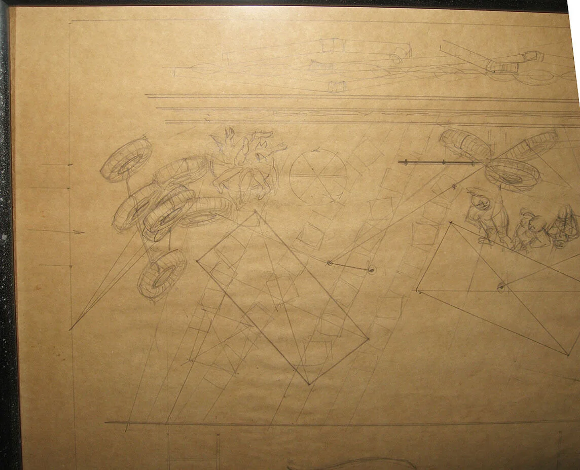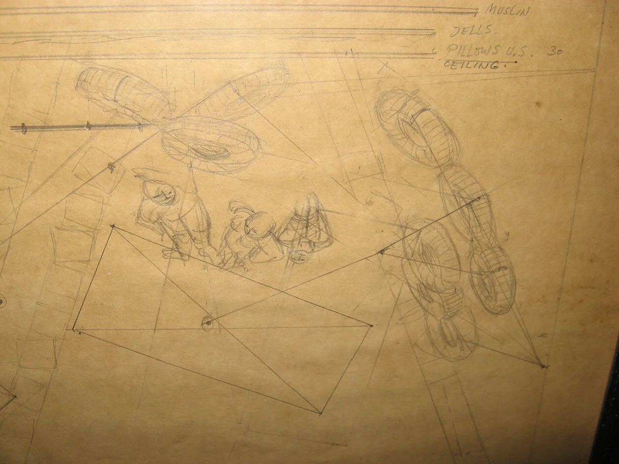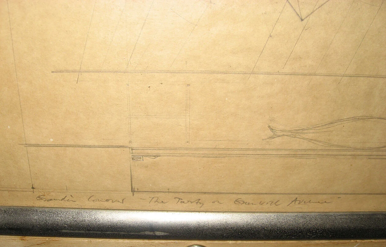 (photo of set design by designer Rouben Ter-Arutunian for the Broadway play The Party on Greenwich Avenue which appeared at the Cherry Lane Theater in 1967. Ter-Arutunian was born in Eastern Europe and studied in Berlin. He was a designer for the Dresden Opera and the Vienna State Opera before emigrating to the U.S. in 1951. In New York Ter-Arutunian became a prolific and influential designer for opera, ballet, and theater. He was the designer for the legendary Balanchine production of the New York City Ballet's Nutcracker, won a Tony award for Redhead in 1959, created numerous addtional designs for Balanchine, and designed for Martha Graham. More drawings are below.)